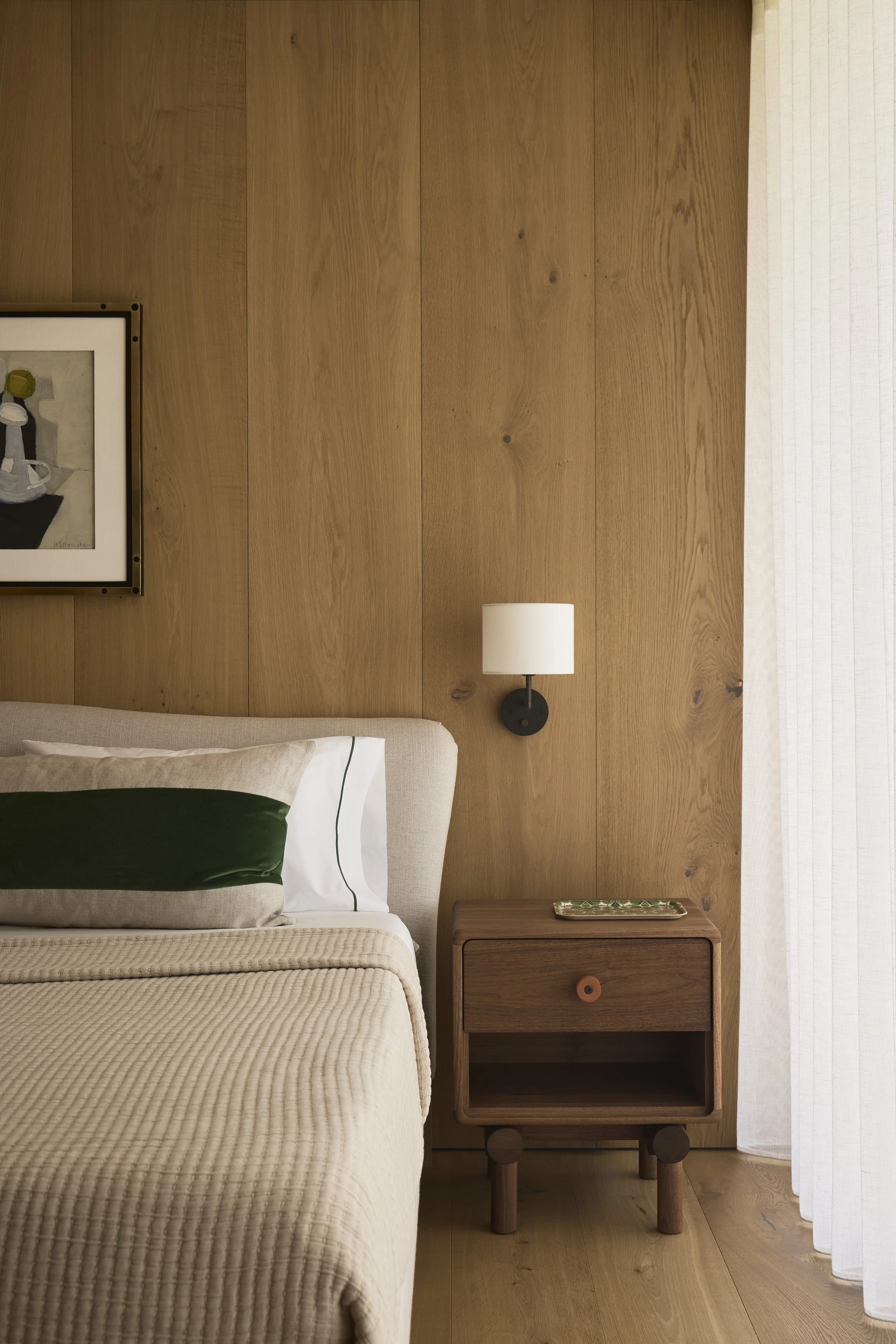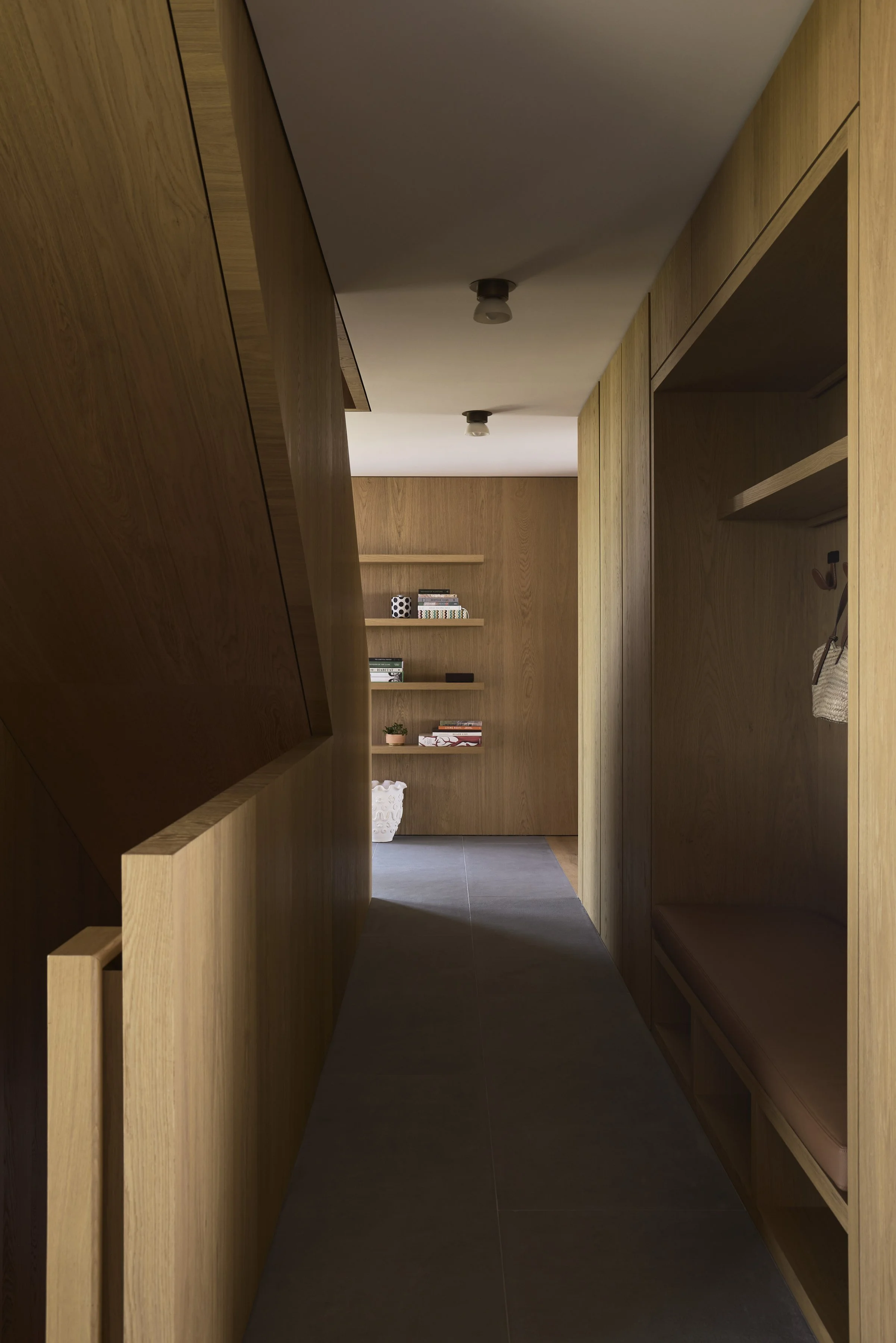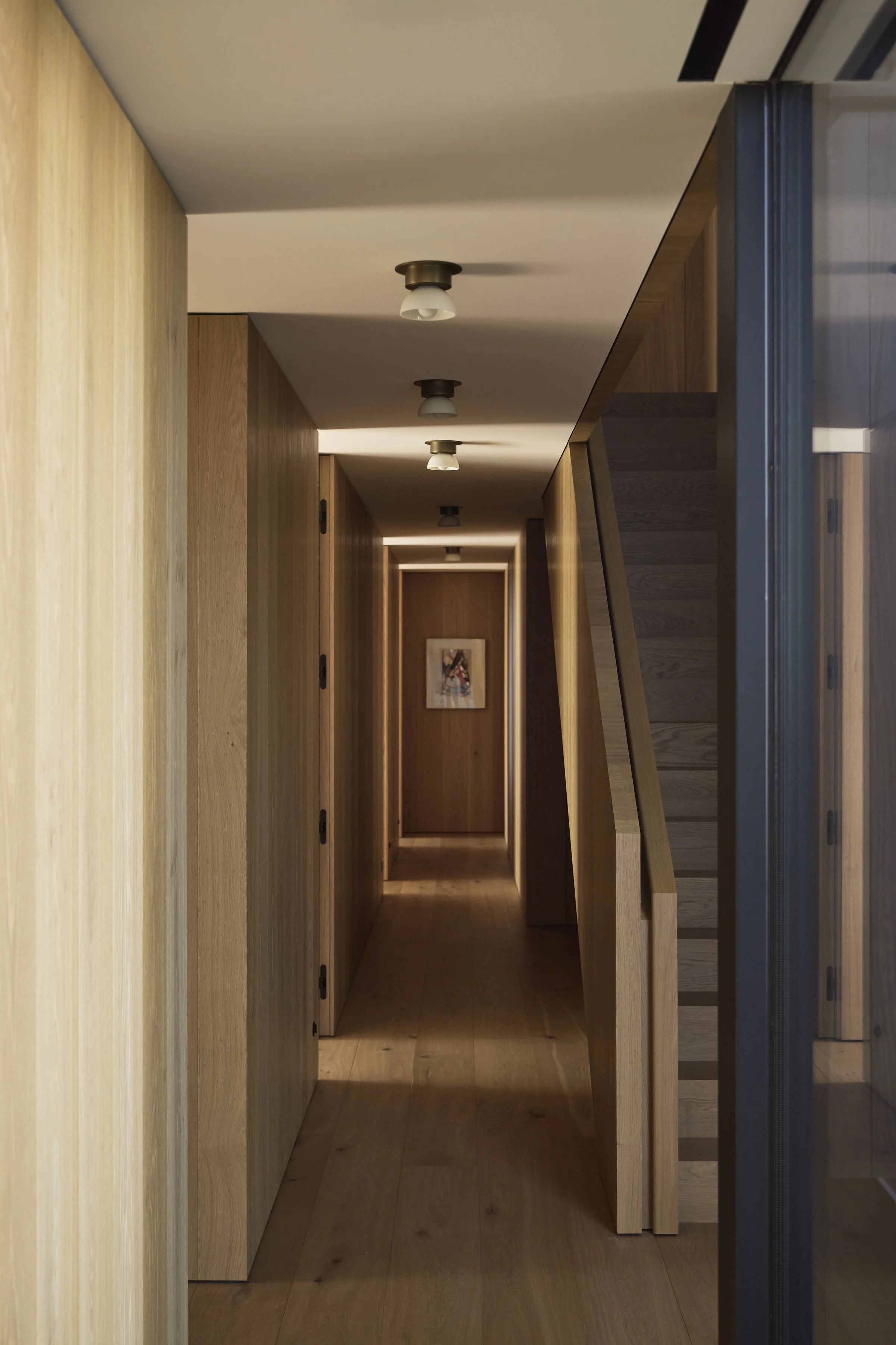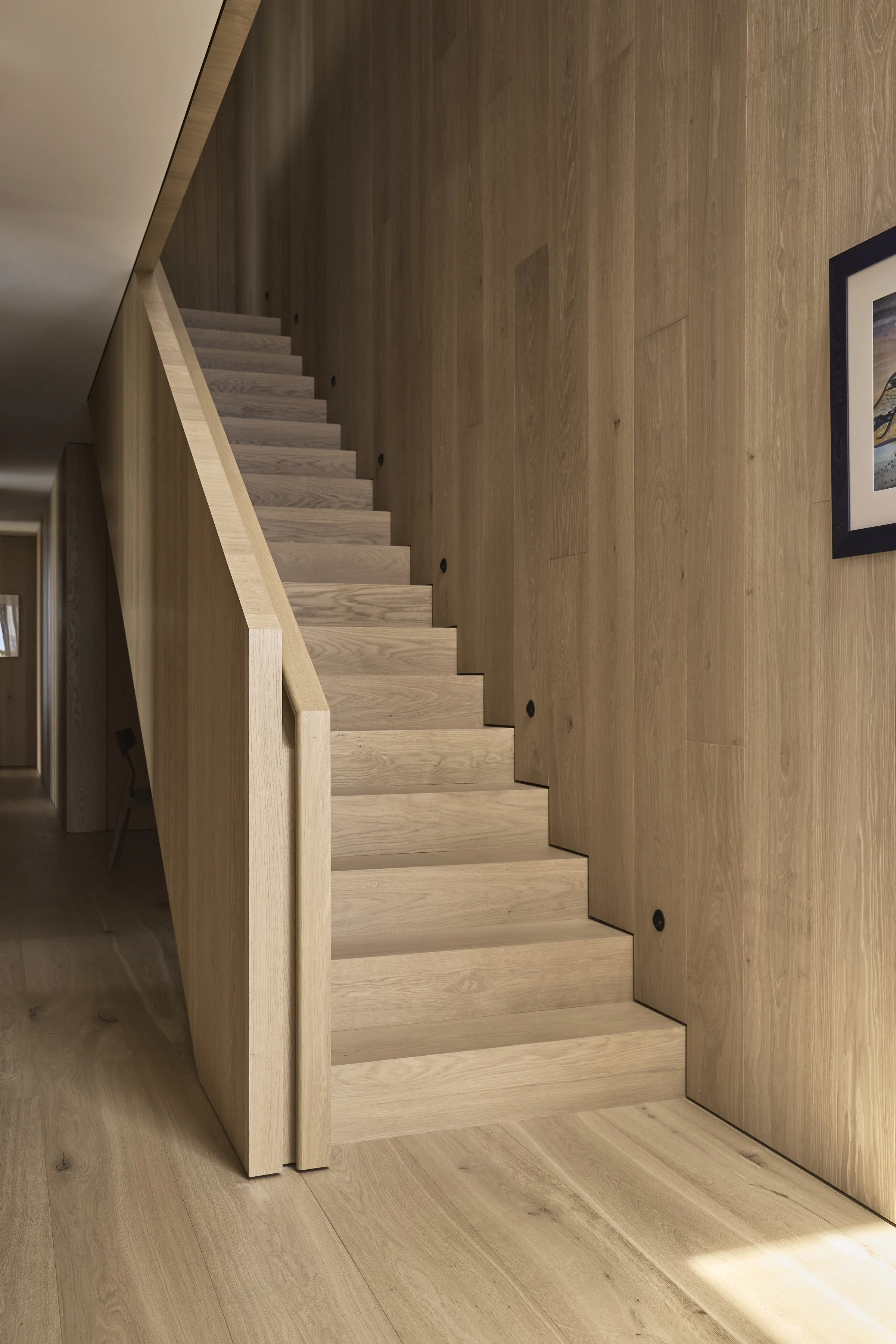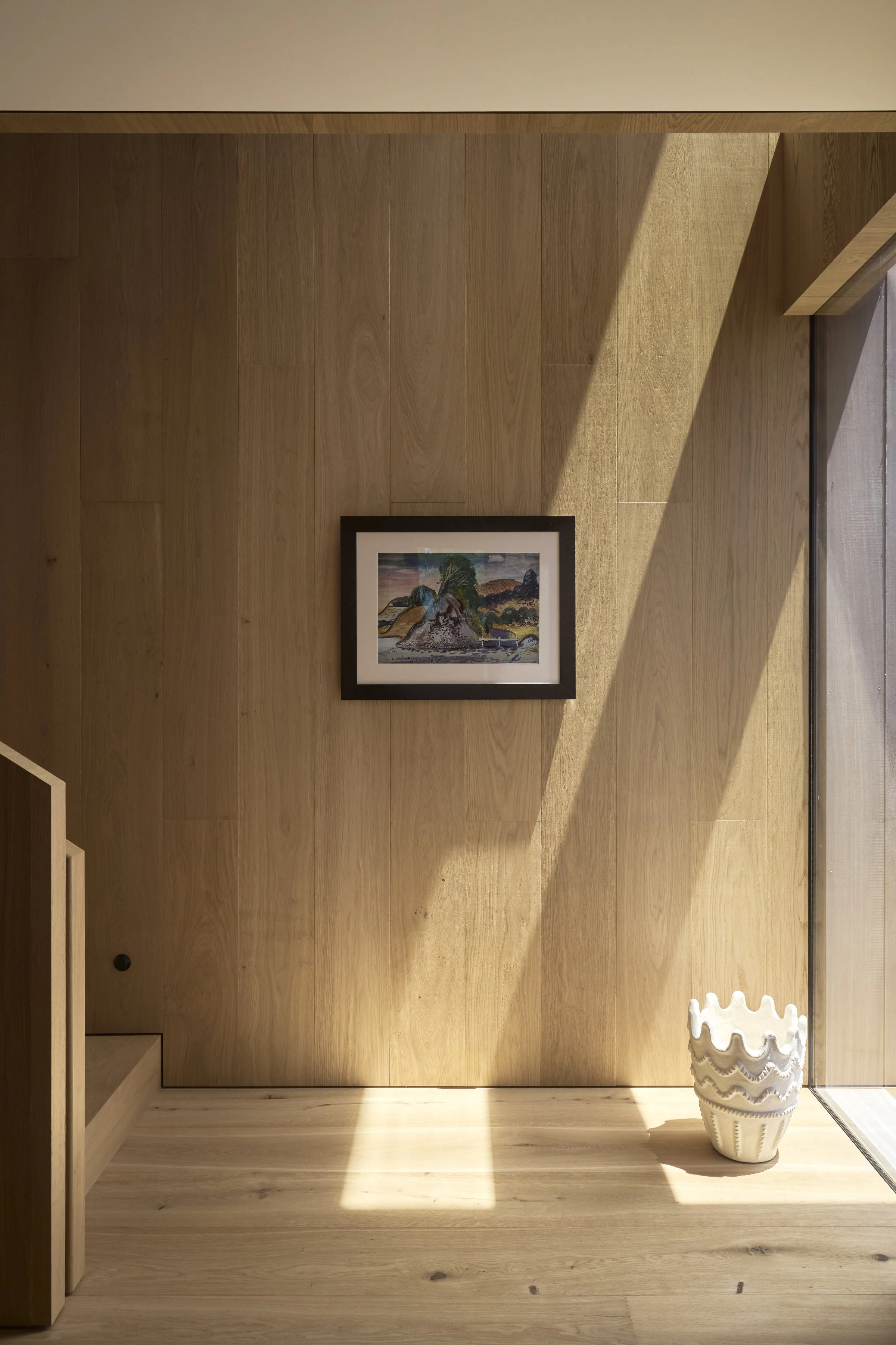 With the interiors clad in oak, a lively palette of color appears as accents in each room. Modest room sizes lend themselves to well proportioned furniture and an overall easy-living appeal. The owners art collection and input on finishes adds a personal touch throughout the house, making for a unique interior space filled with character.