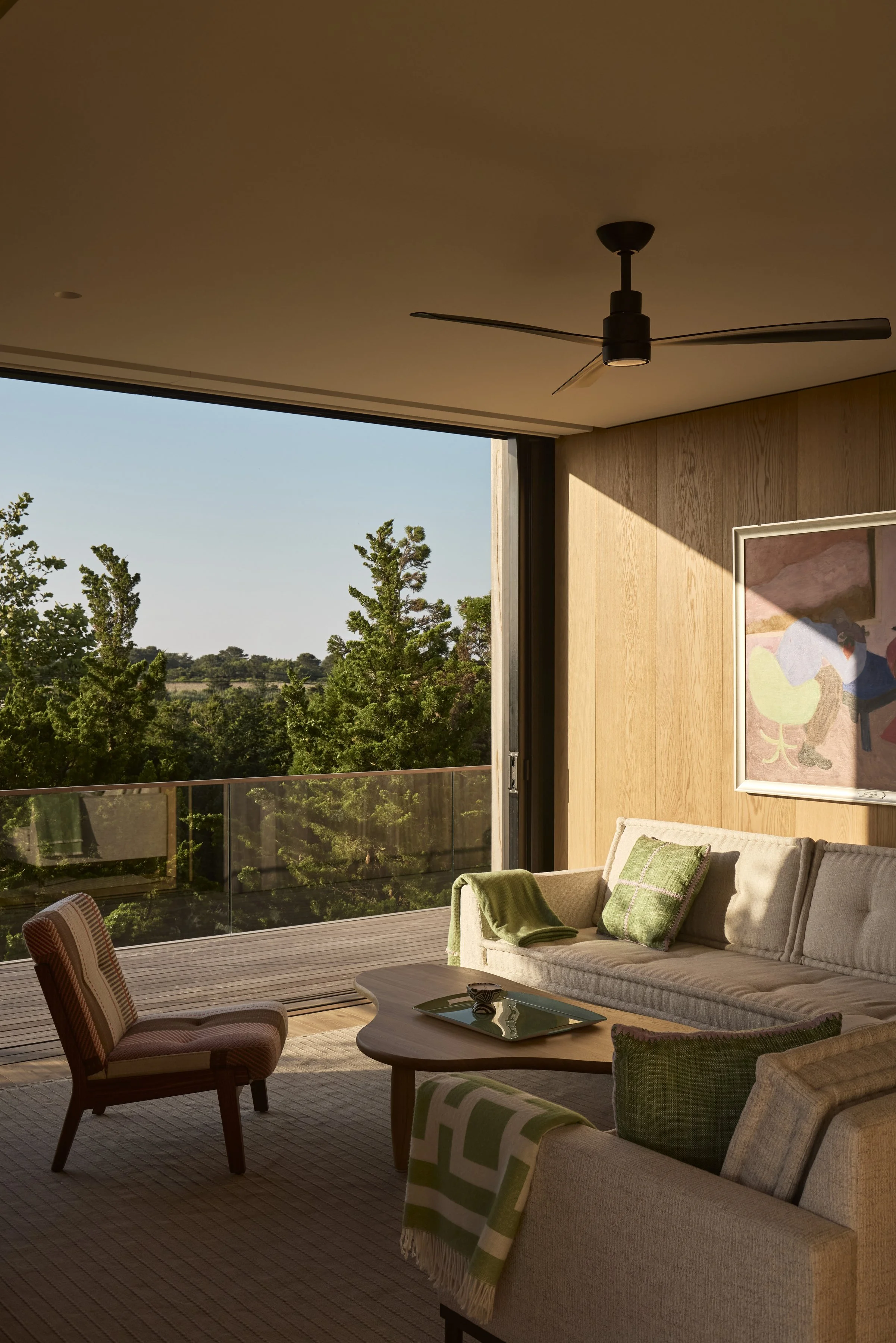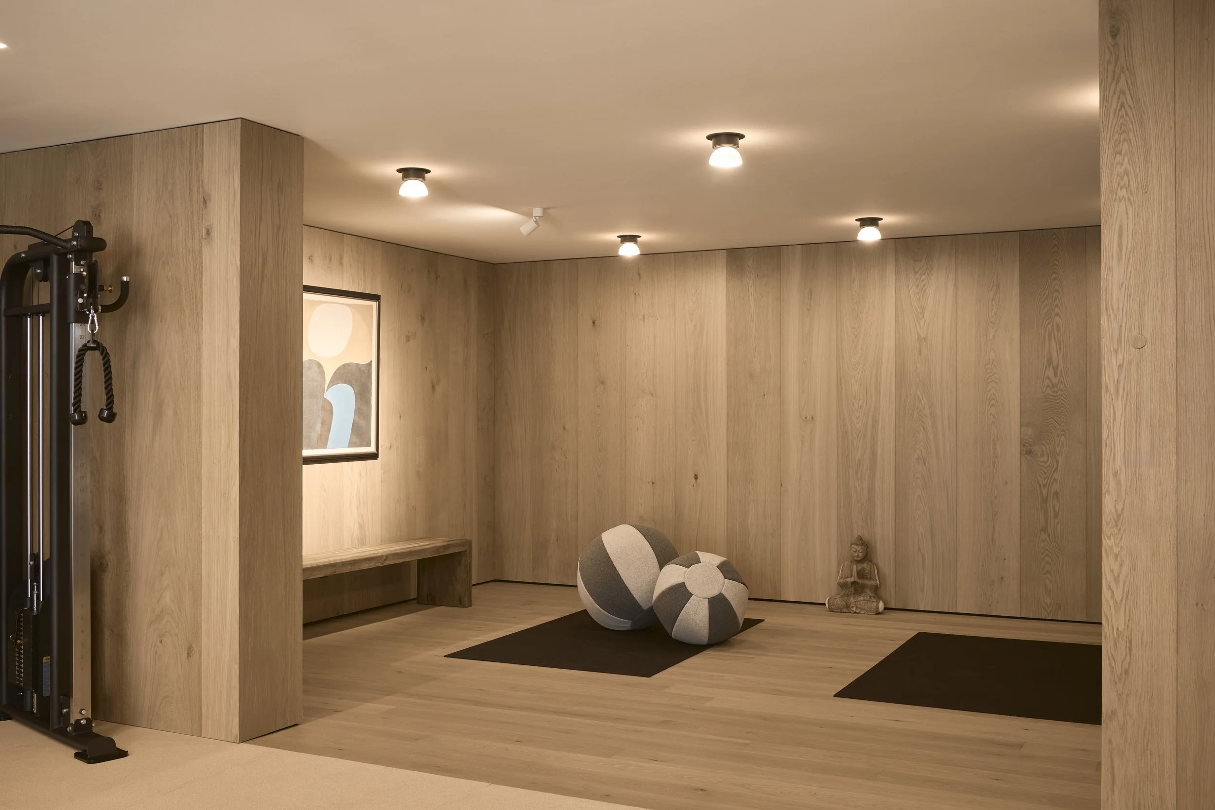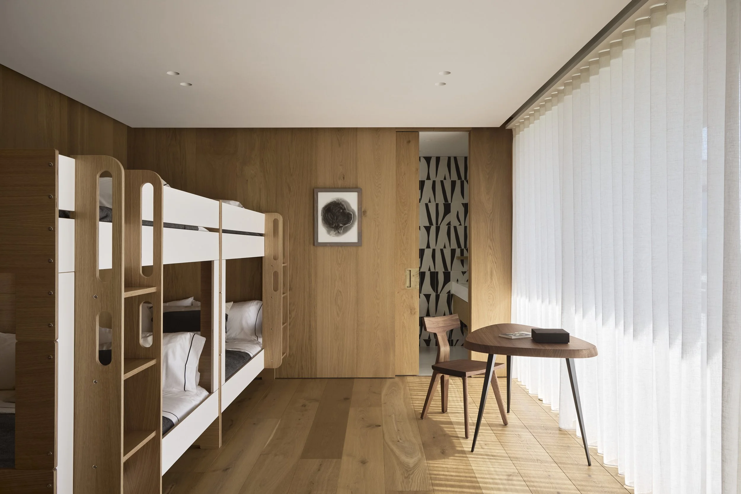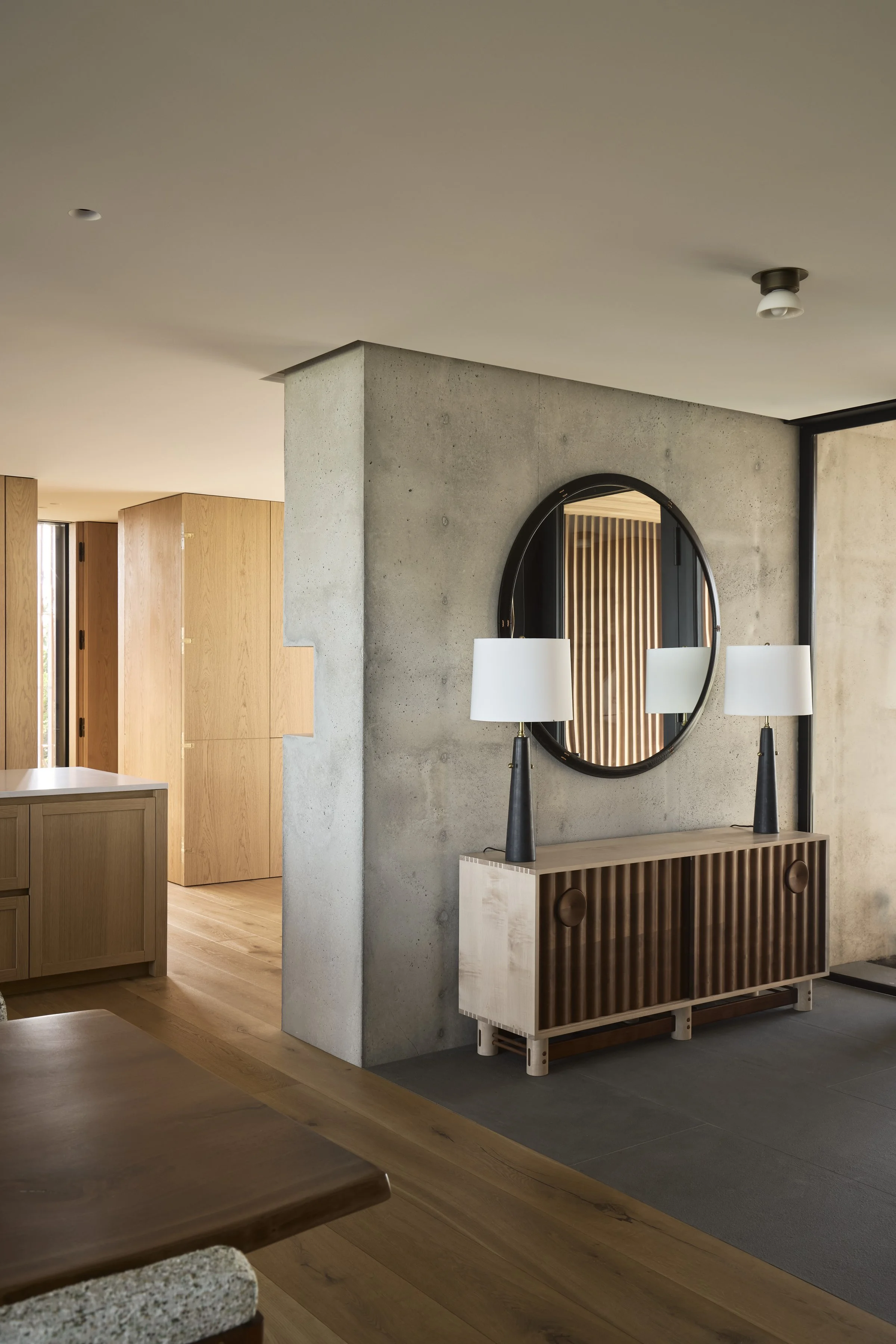 With the interiors clad in oak, a lively palette of color appears as accents in each room. Modest room sizes lend themselves to well proportioned furniture and an overall easy-living appeal. The owners art collection and input on finishes adds a personal touch throughout the house, making for a unique interior space filled with character.