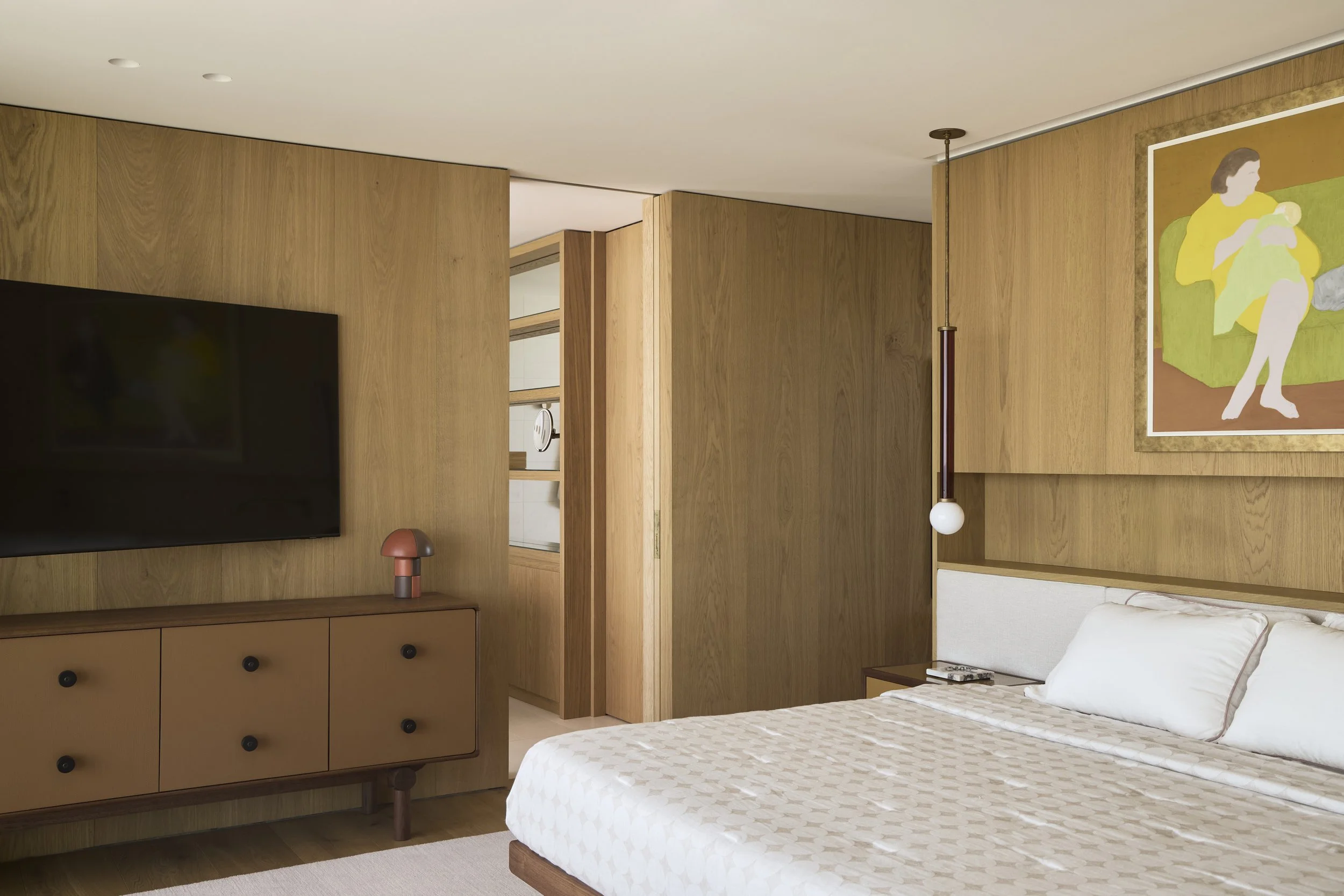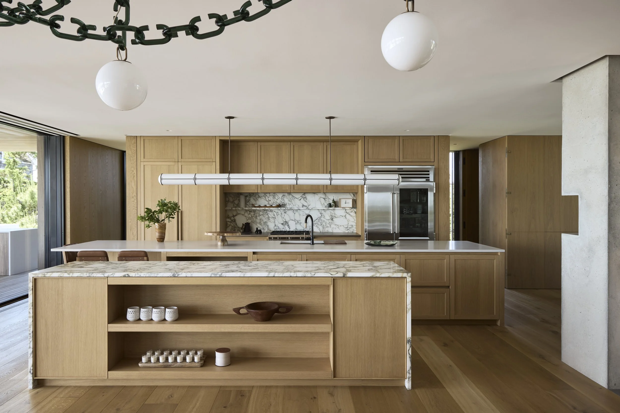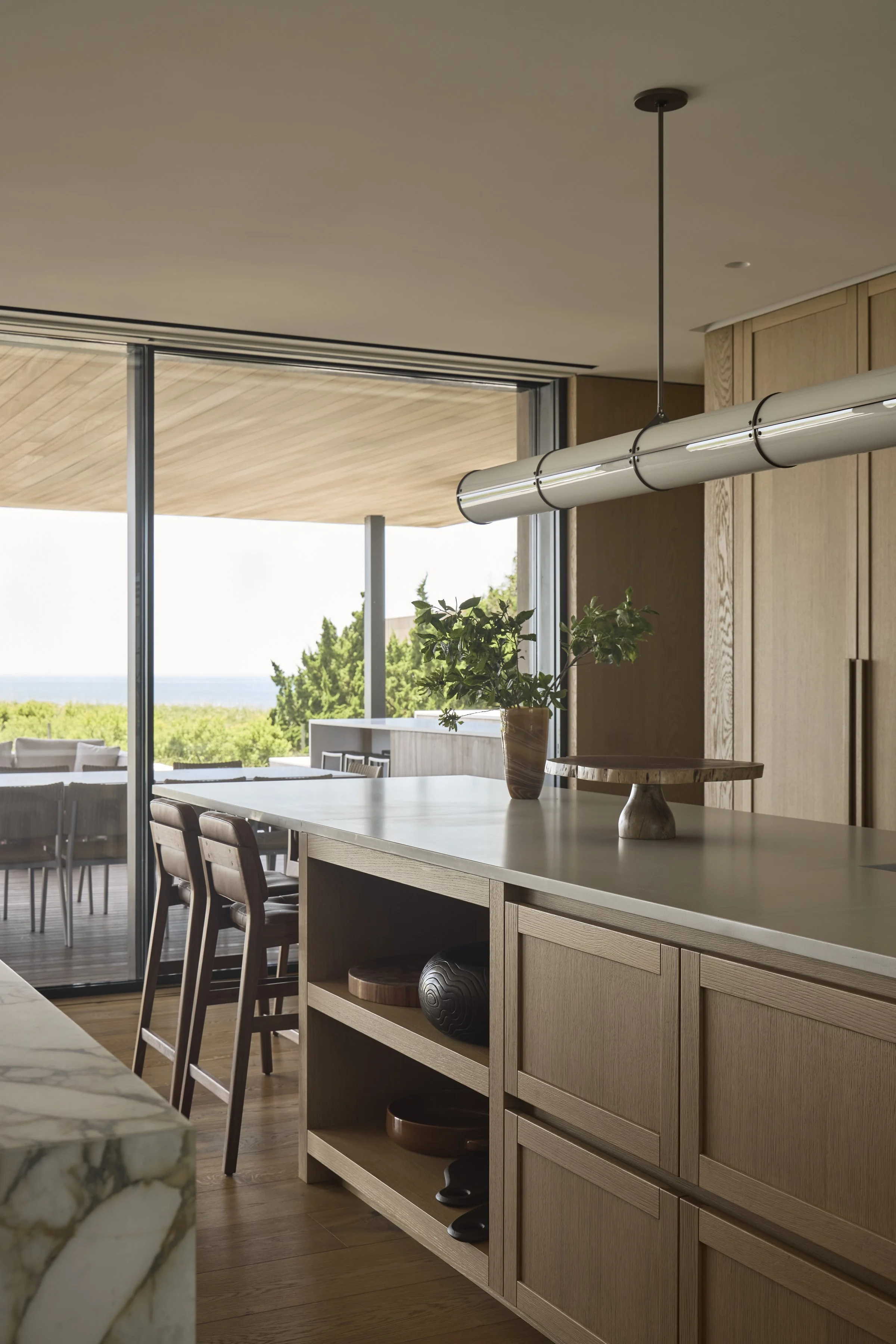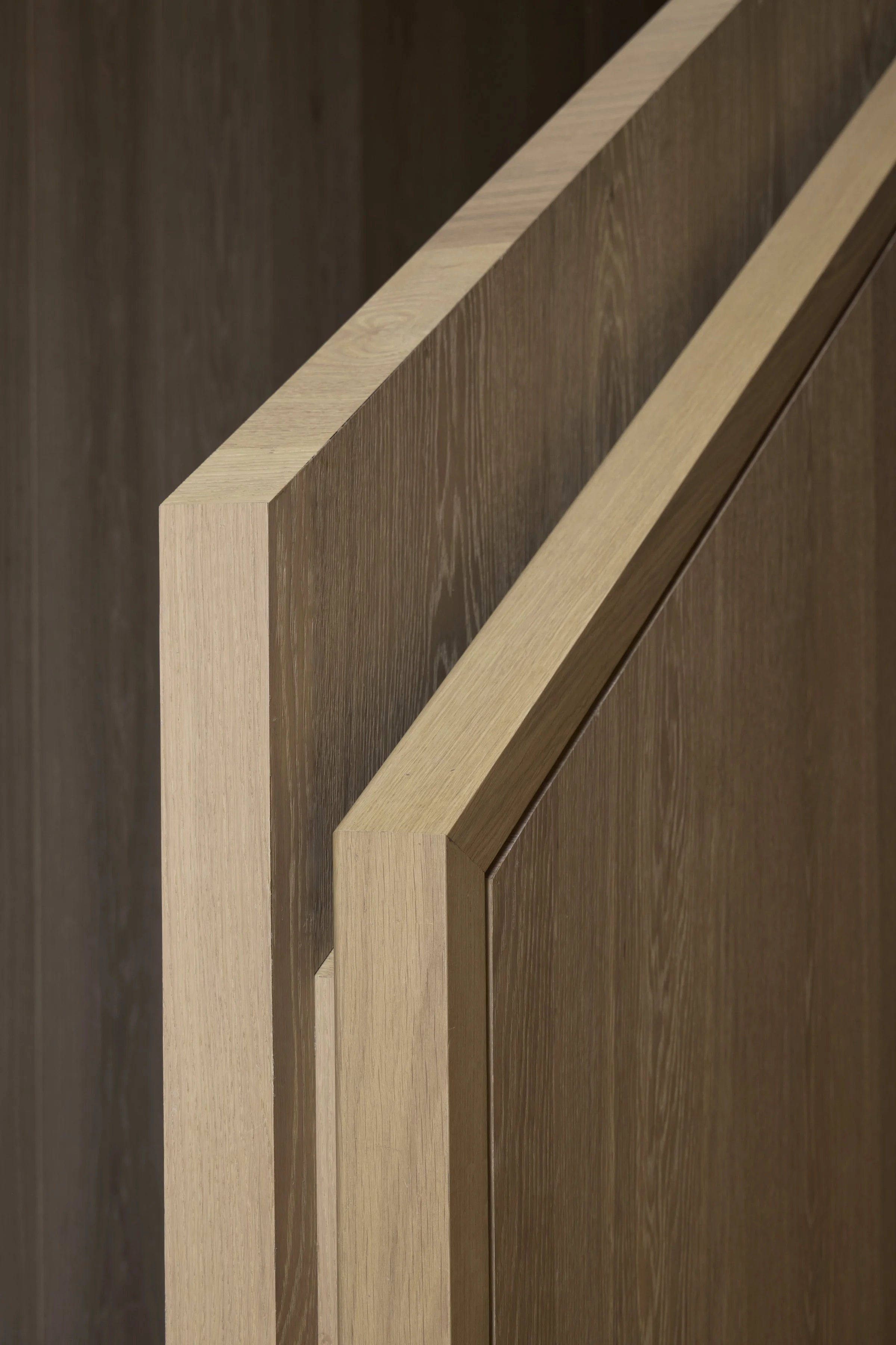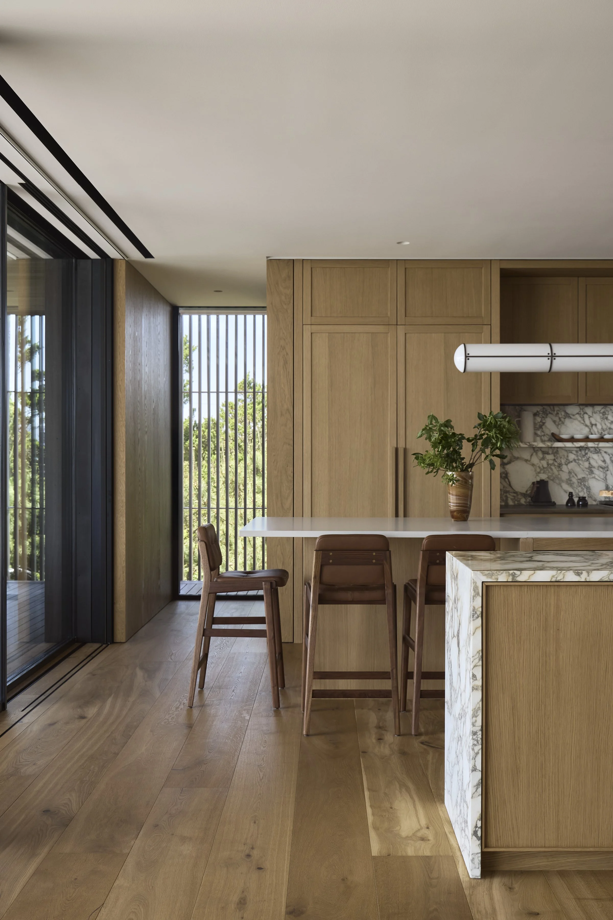 With the interiors clad in oak, a lively palette of color appears as accents in each room. Modest room sizes lend themselves to well proportioned furniture and an overall easy-living appeal. The owners art collection and input on finishes adds a personal touch throughout the house, making for a unique interior space filled with character.