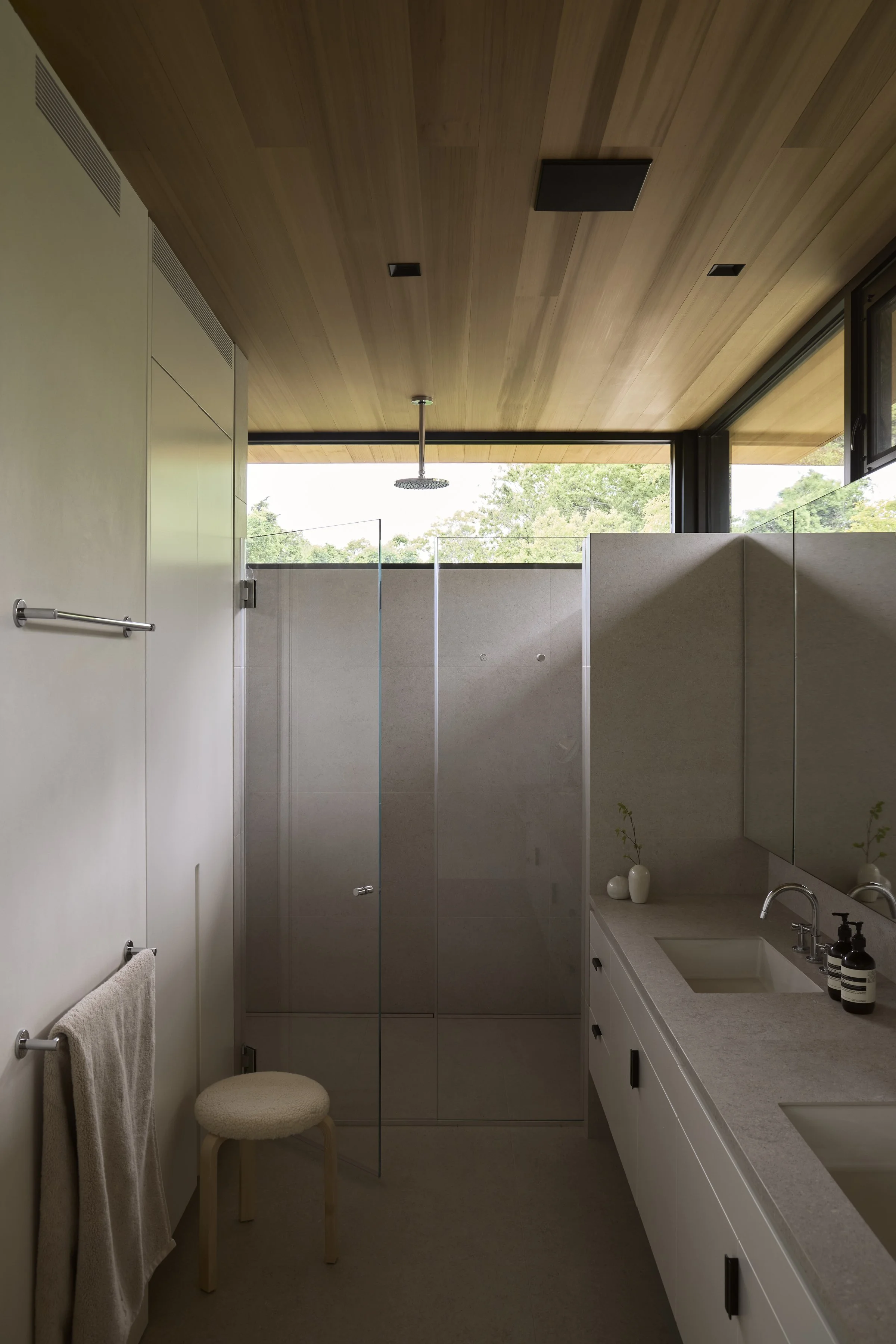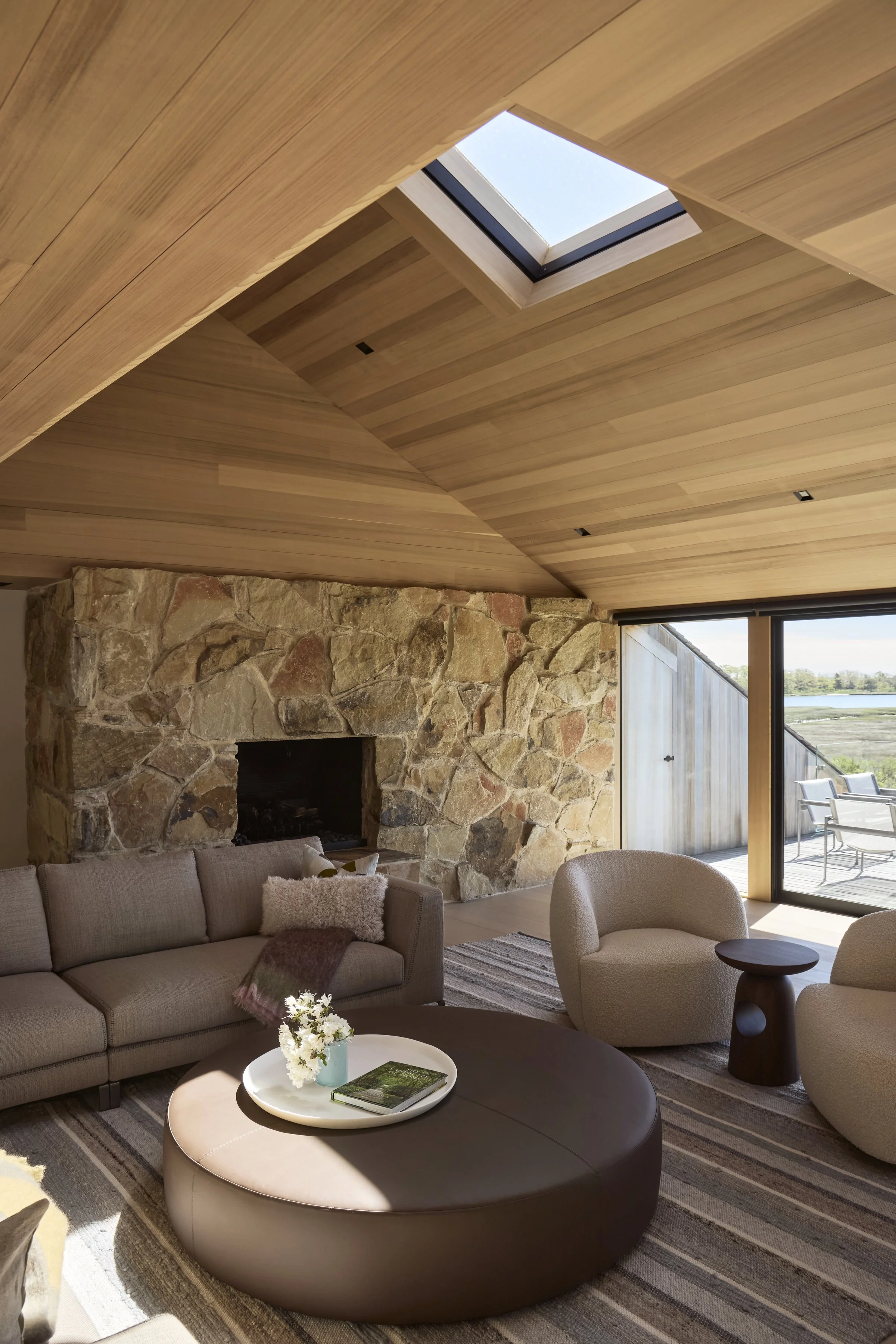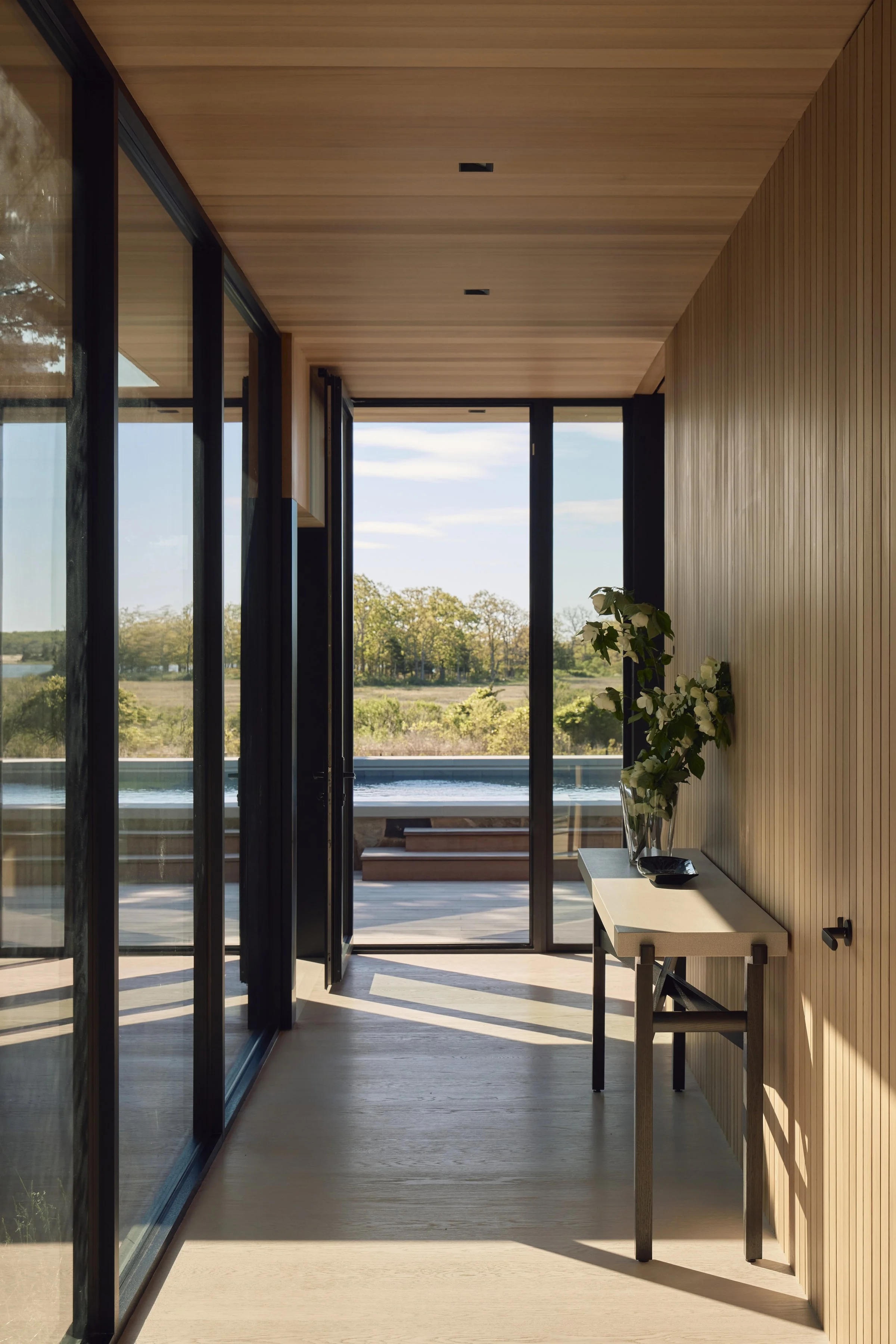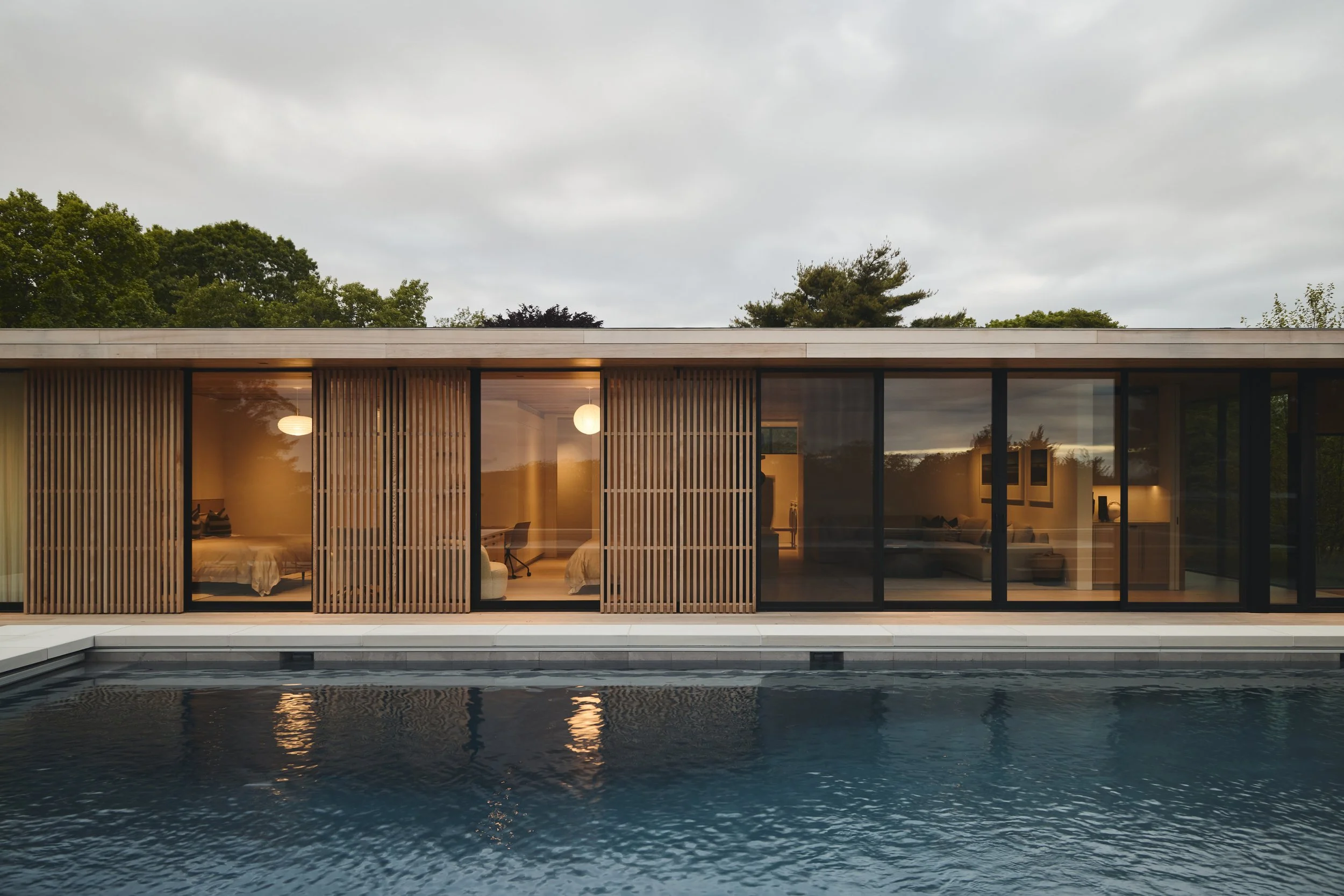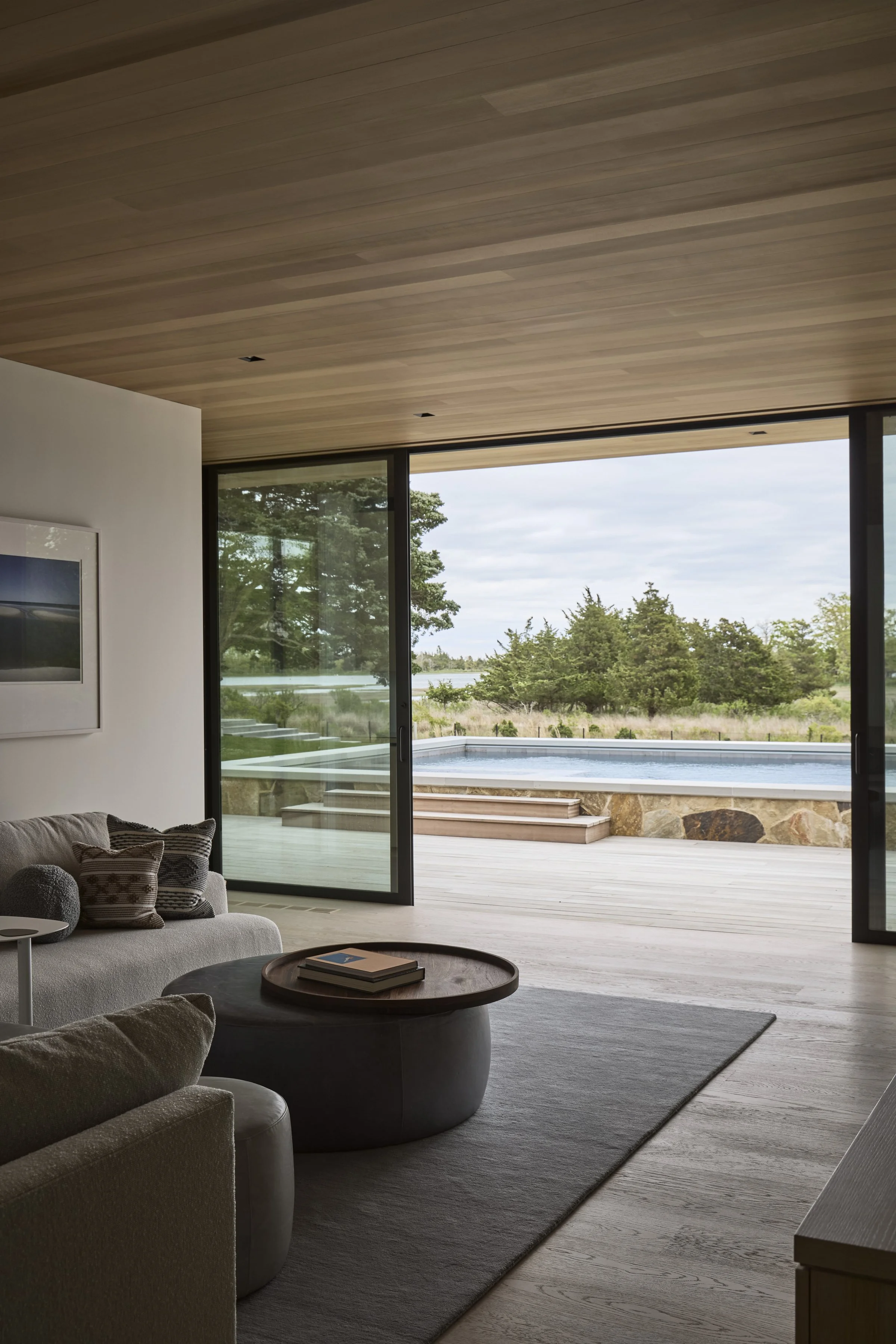The existing state of the house called for a complete gut renovation. We used this opportunity to carefully streamline the interior details and materials to follow Jaffe’s celebration of light and simplicity. A flat roof addition pierces the east side, allowing the space needed to redesign and enlarge the kitchen and add a much-needed screened dining porch. The upstairs primary bedroom was redesigned as a family room, and the existing bedrooms were carefully reconsidered to allow for en-suite bathrooms. An addition consisting of the main bedrooms, family room and gym; quiet and supportive of the main house, was added to the west. The furnishings, lighting and art all were selected as both a celebration of the past with an eye towards the future.