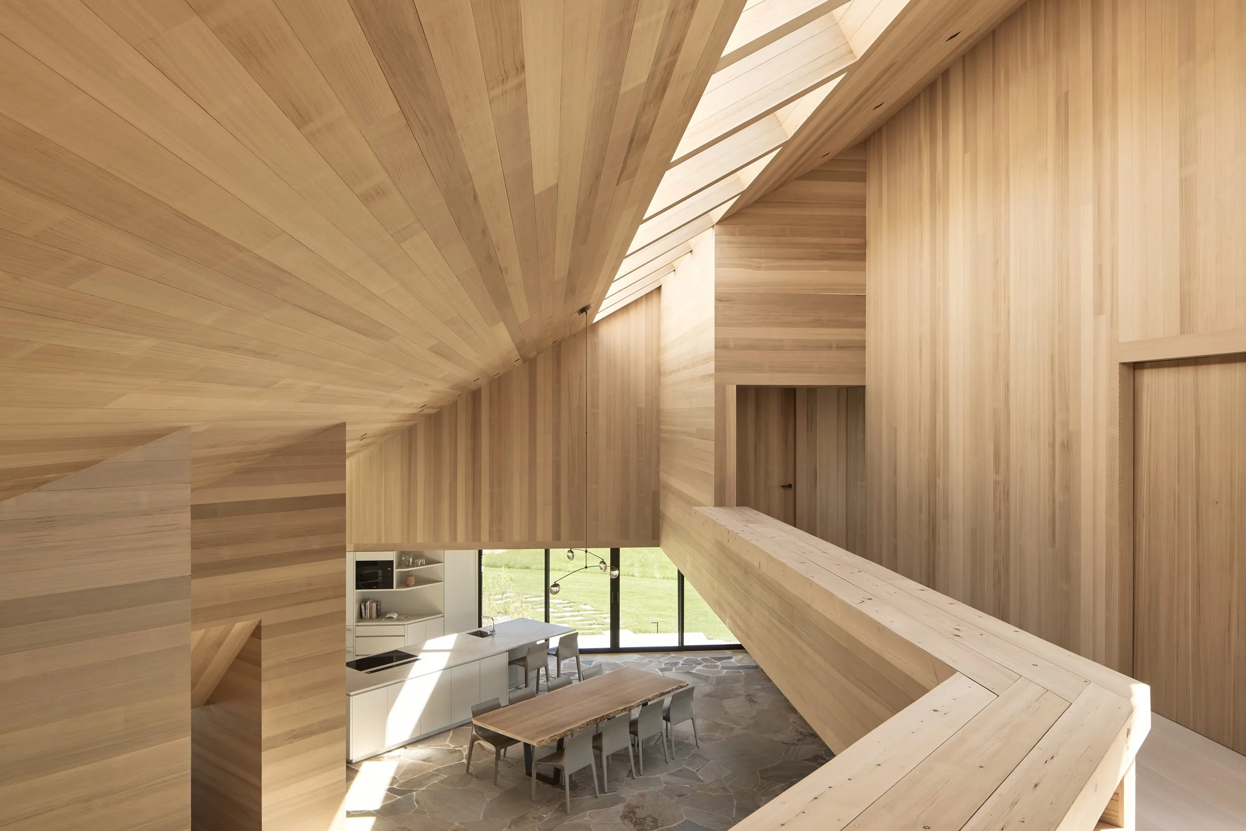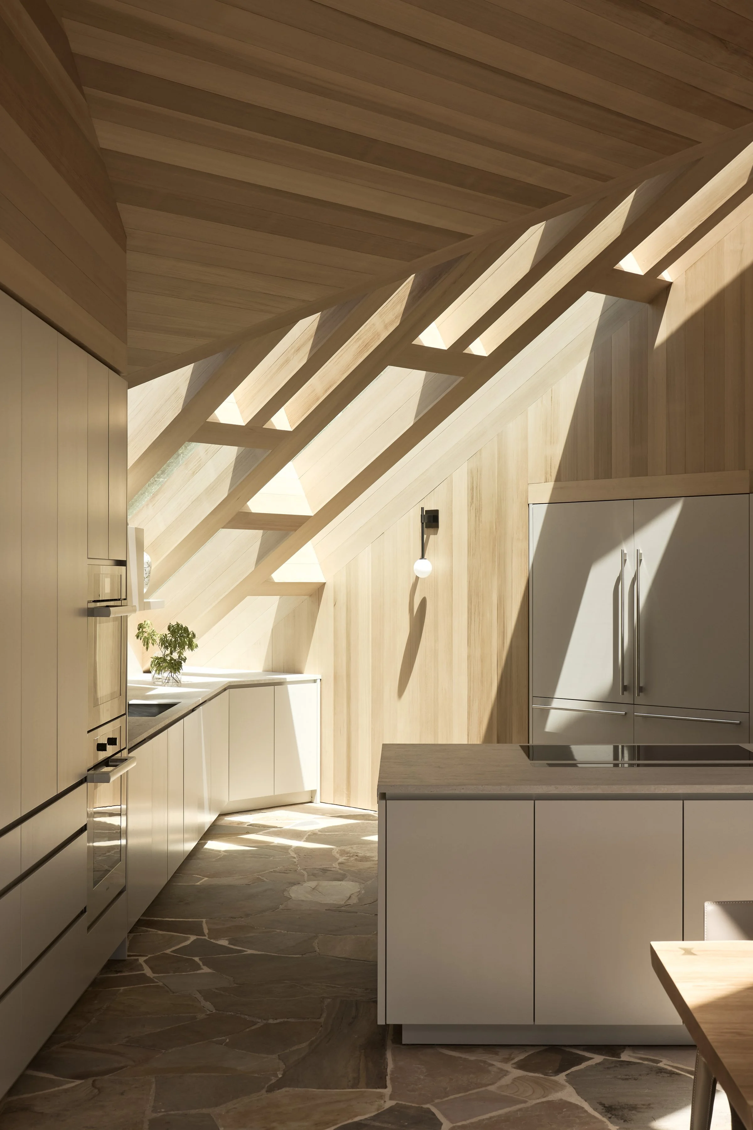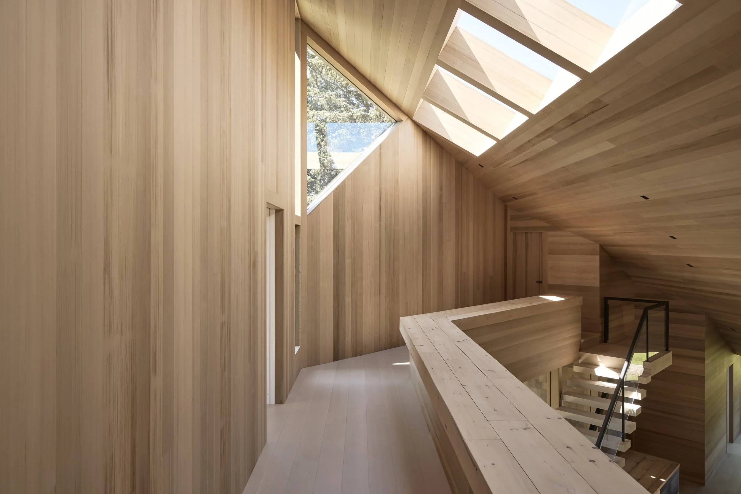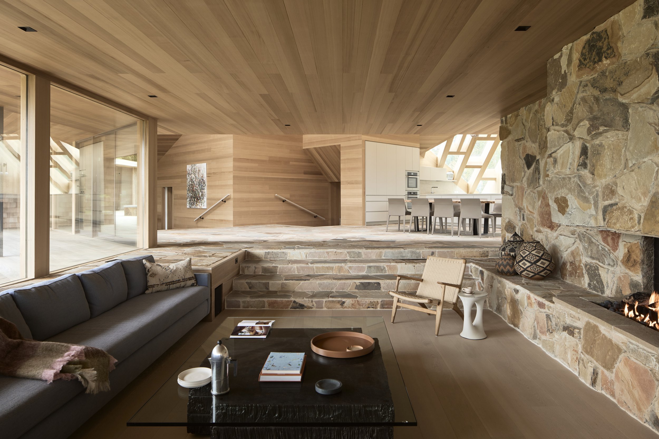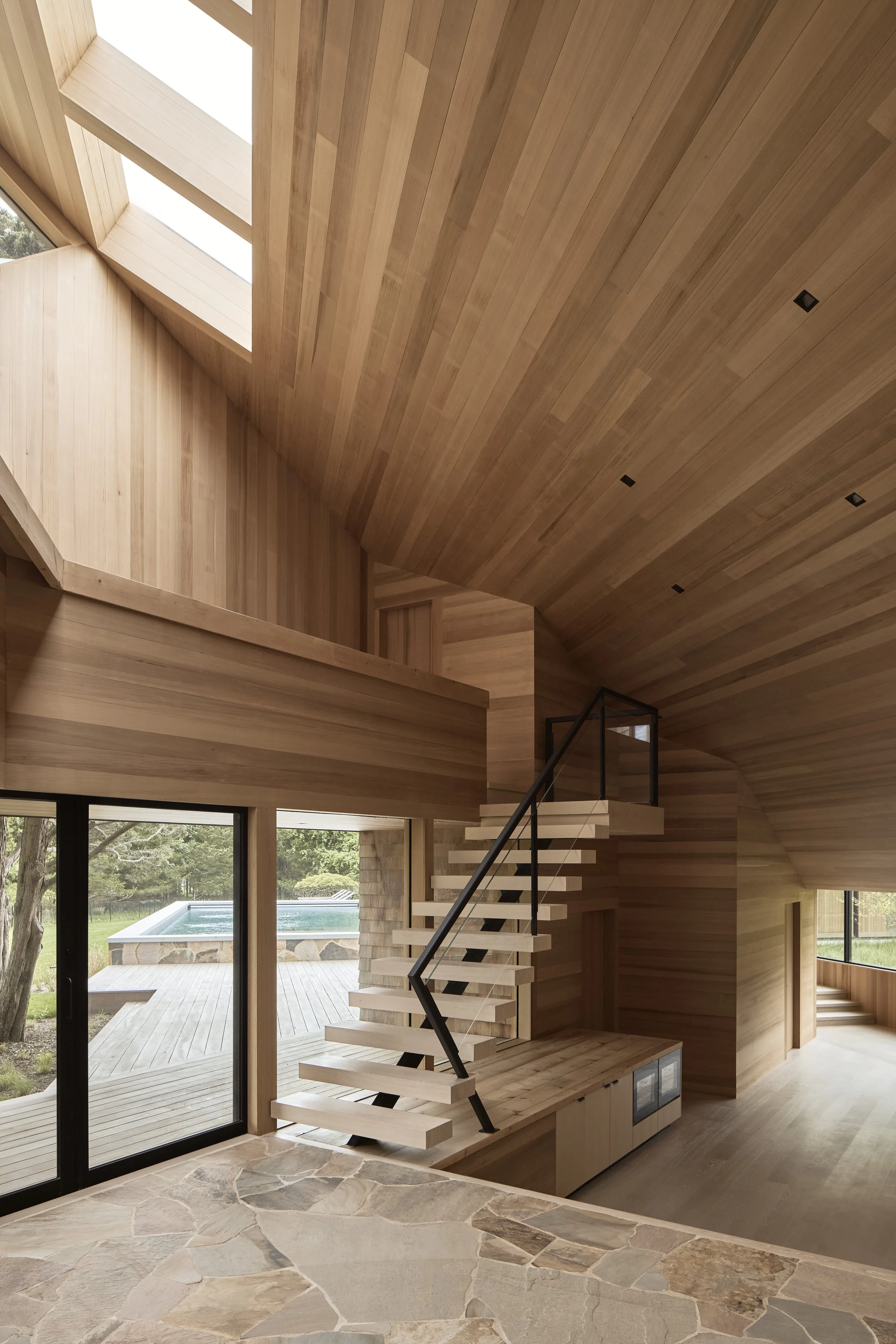 The existing state of the house called for a complete gut renovation. We used this opportunity to carefully streamline the interior details and materials to follow Jaffe’s celebration of light and simplicity. A flat roof addition pierces the east side, allowing the space needed to redesign and enlarge the kitchen and add a much-needed screened dining porch. The upstairs primary bedroom was redesigned as a family room, and the existing bedrooms were carefully reconsidered to allow for en-suite bathrooms. An addition consisting of the main bedrooms, family room and gym; quiet and supportive of the main house, was added to the west. The furnishings, lighting and art all were selected as both a celebration of the past with an eye towards the future.